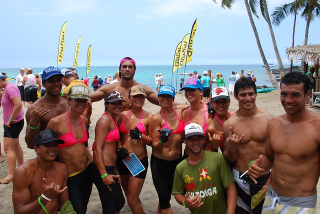 Saturday Wa’a Kaukahi (single hull canoes) – The women start this event paddling 18 miles from Kailua Bay to Honaunau and the men then bring it back 18 miles. Team Primo led by Kai Bartlett of Maui won the men’s Iron Open 18 mile race in a time of 1:53:56 and the Team Calgary Canada won the women’s Iron Open 18 mile race in a time of 2:10:59. The first day’s events ended with a torch light parade where over 500 people participated.