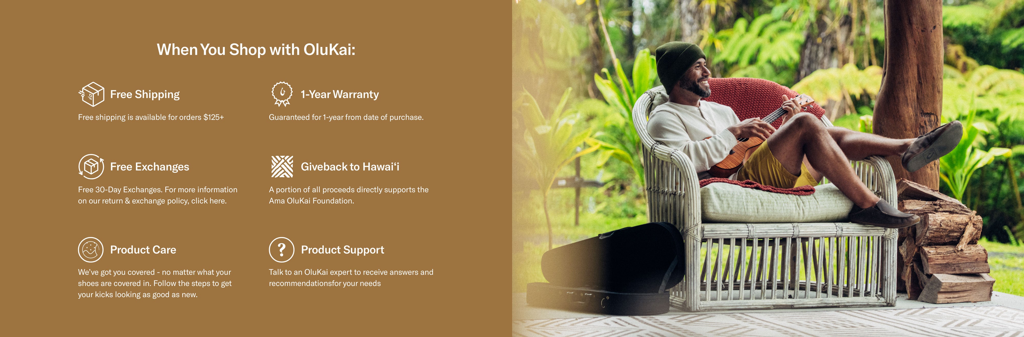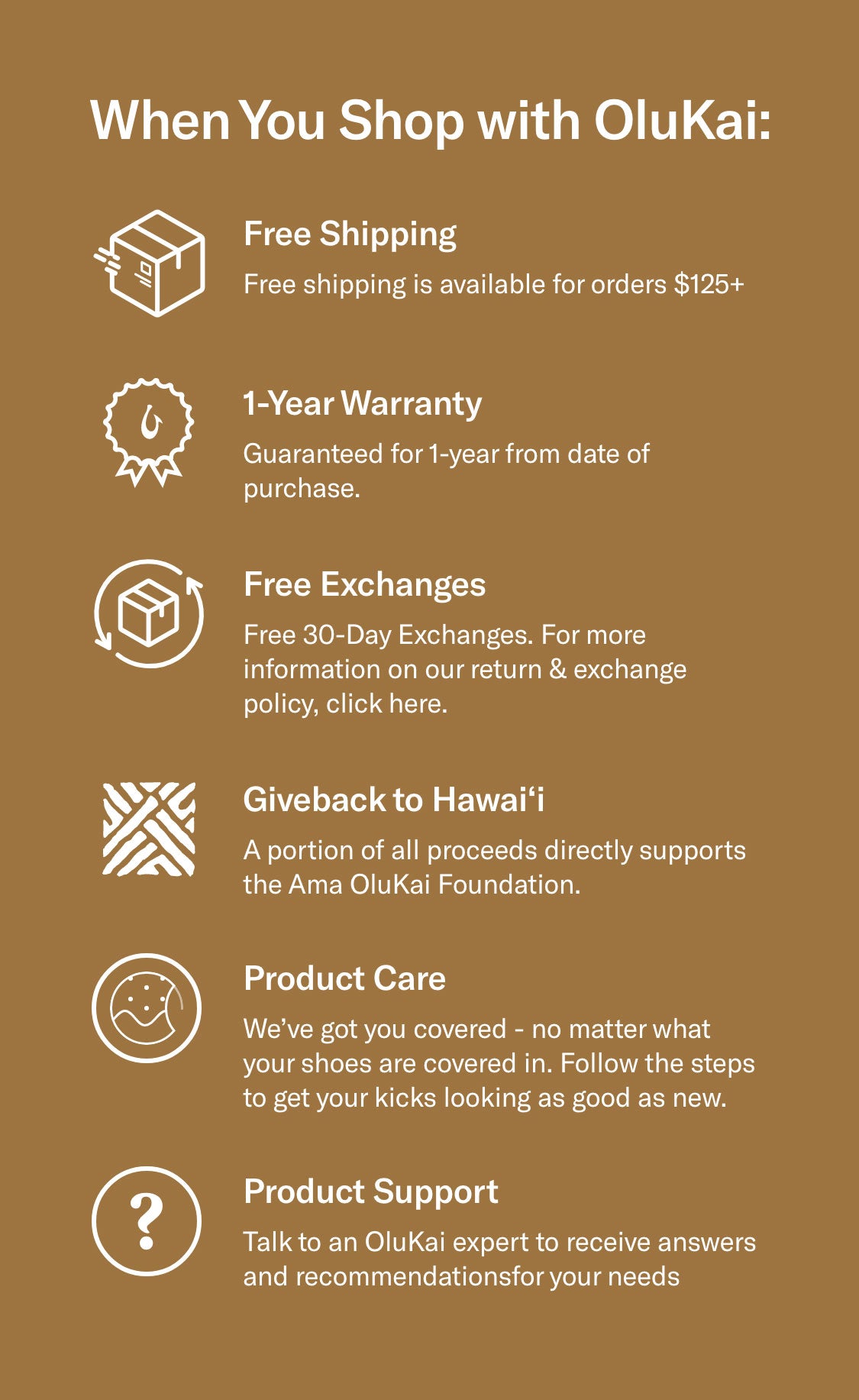 OluKai footwear is guaranteed from manufacture for one year from the date of purchase.