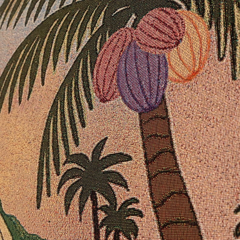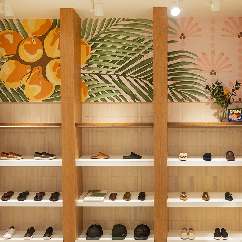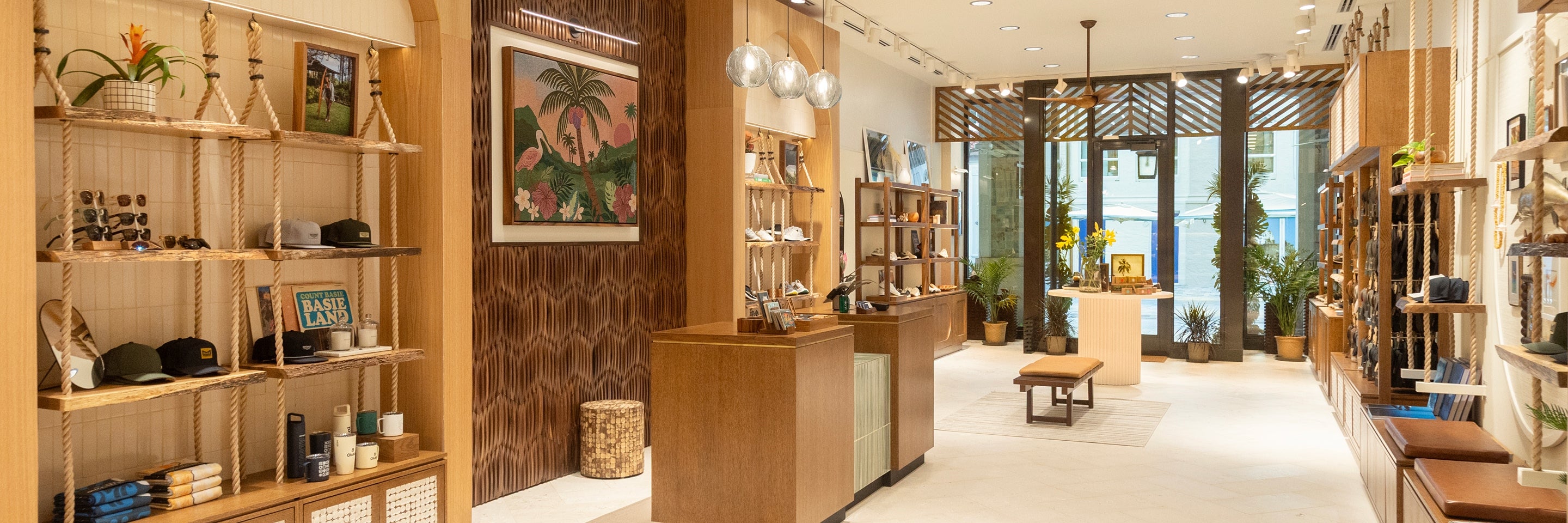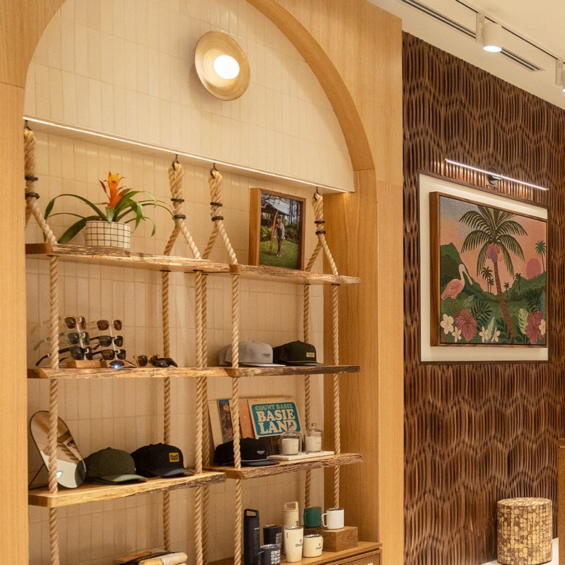Florida’s Devin Noel created a custom coconut palm mural with a repeating pattern and enlarged palm motif, while Hawai‘i-based artist Vidaloh designed a handwoven textile artwork situated behind the cashwrap.