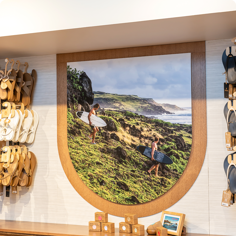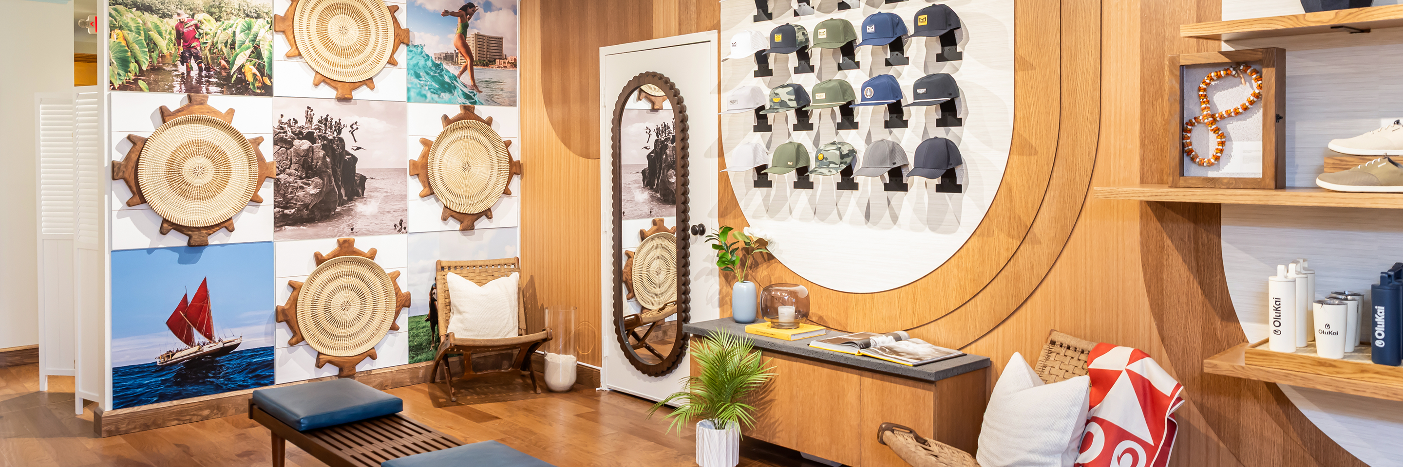 The walls of the Charleston store bring our Anywhere Aloha mantra to life through artwork created by artists from both Hawai‘i and Charleston. From the Islands, Kristen Reyno of Lola Pilar crafted a large-scale collage of tropical flowers, pineapples, and lei—photographed and mounted as a vibrant focal point behind the cash wrap. From Charleston, Gullah artist Corey Alston contributed his handwoven sweetgrass baskets, which are blended into display tables and wall features.