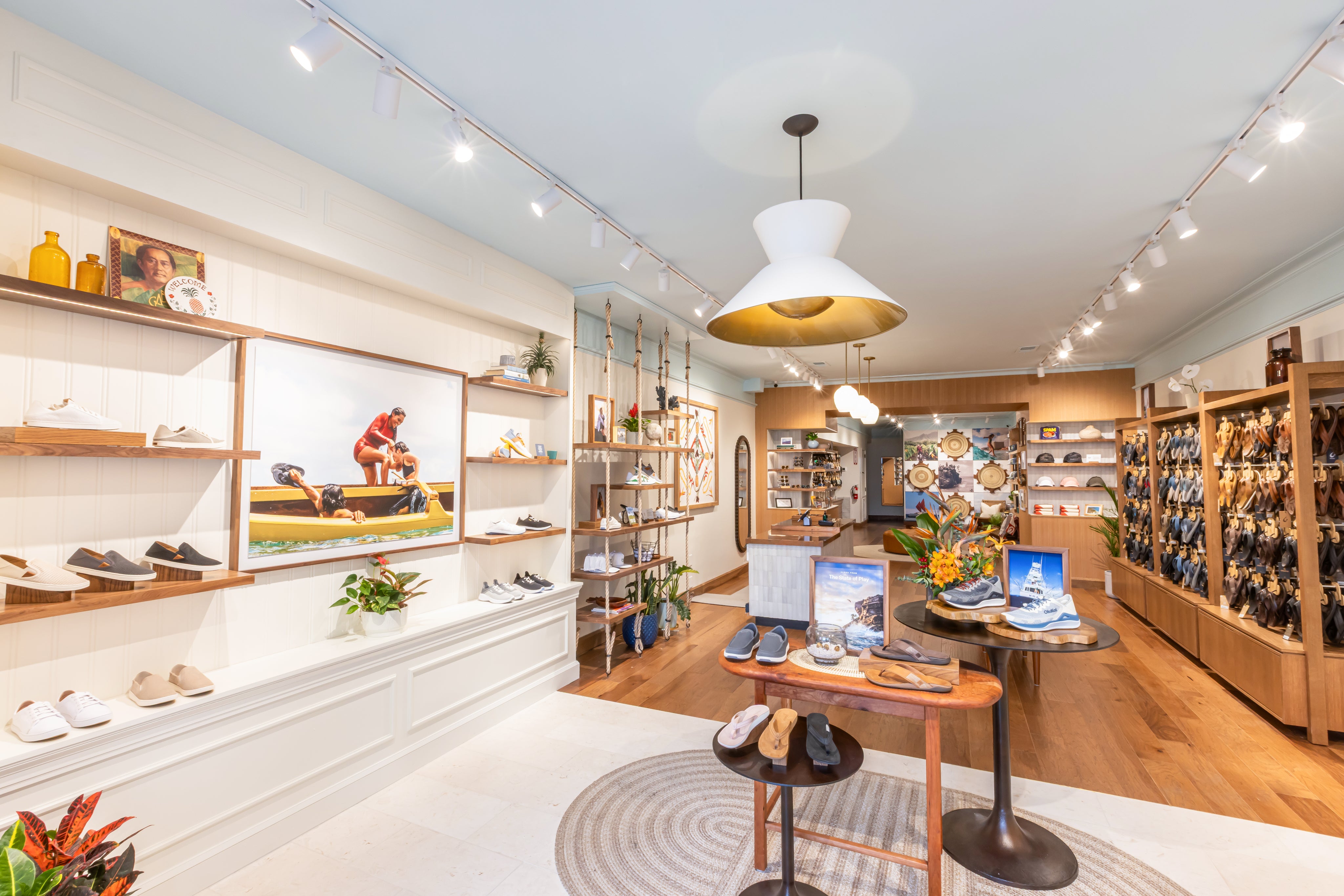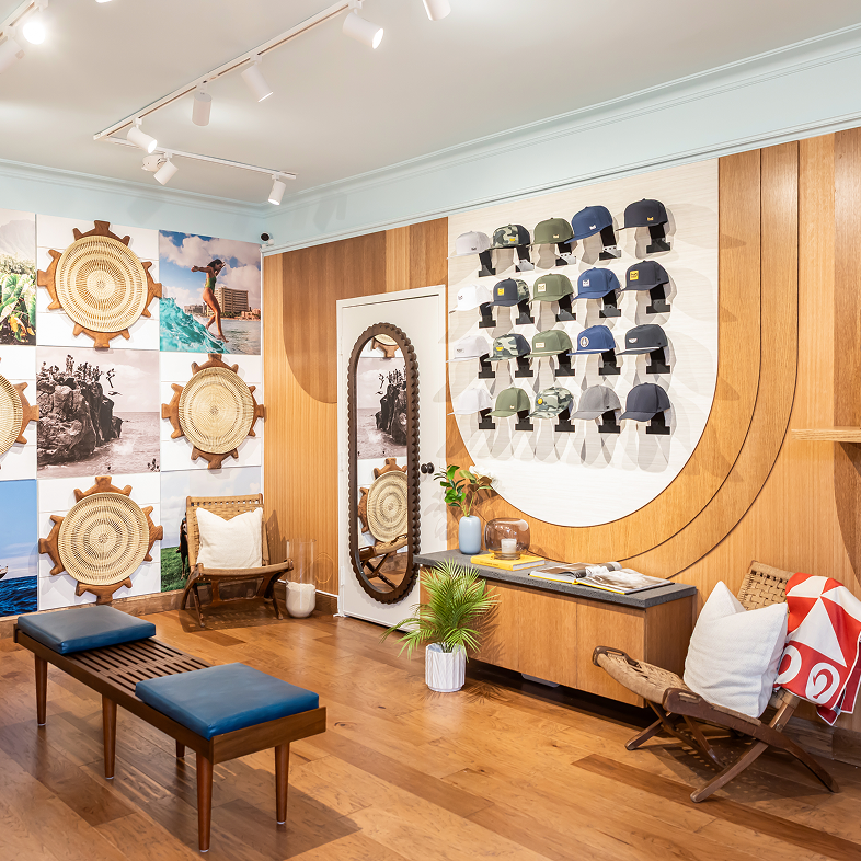 A thoughtful blend of regional and island-inspired materials gives the Charleston store its distinct character. Coral tile and soft wood tones, shaped in the arc of a lei, create a visual rhythm throughout the space. Paying homage to Charleston’s history, a copper counter anchors the cash wrap, and the ceiling is painted “haint blue,” a color believed to invite good energy.