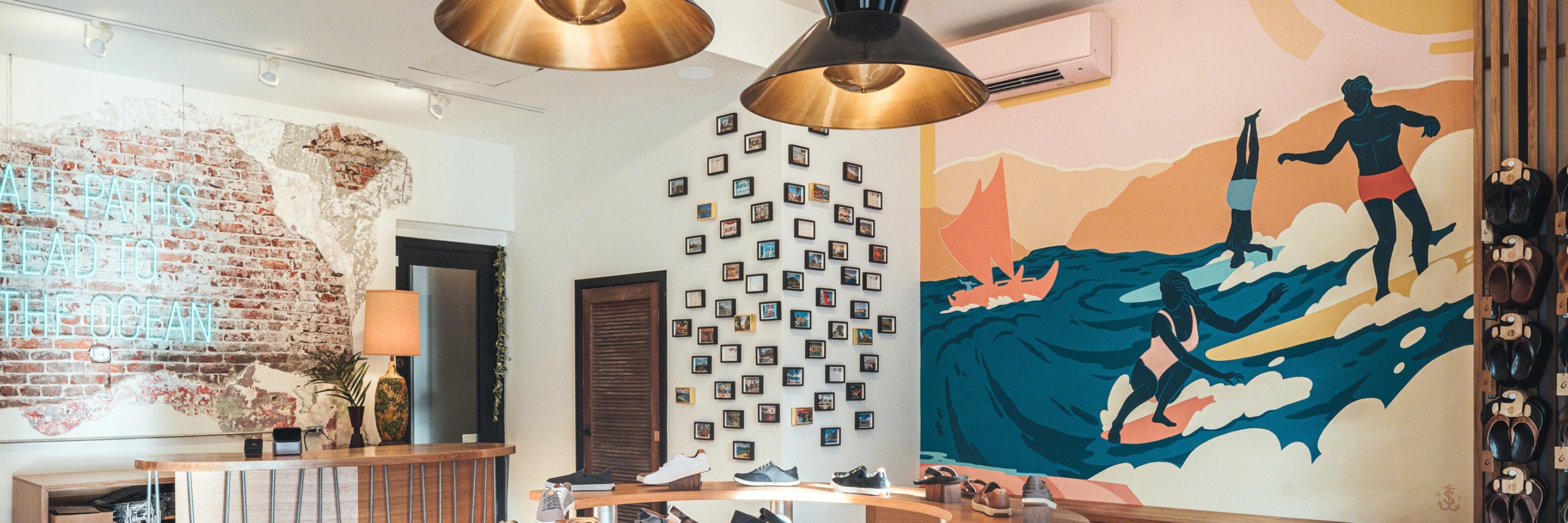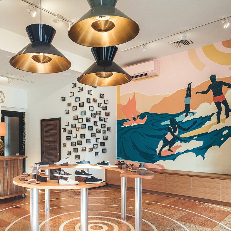 Lining the walls of the store are custom-made wooden fixtures and an artisan cash wrap, all of which have been hand-crafted from premium wood and OluKai leather by local craftsman Dae Son of Wood Hi.