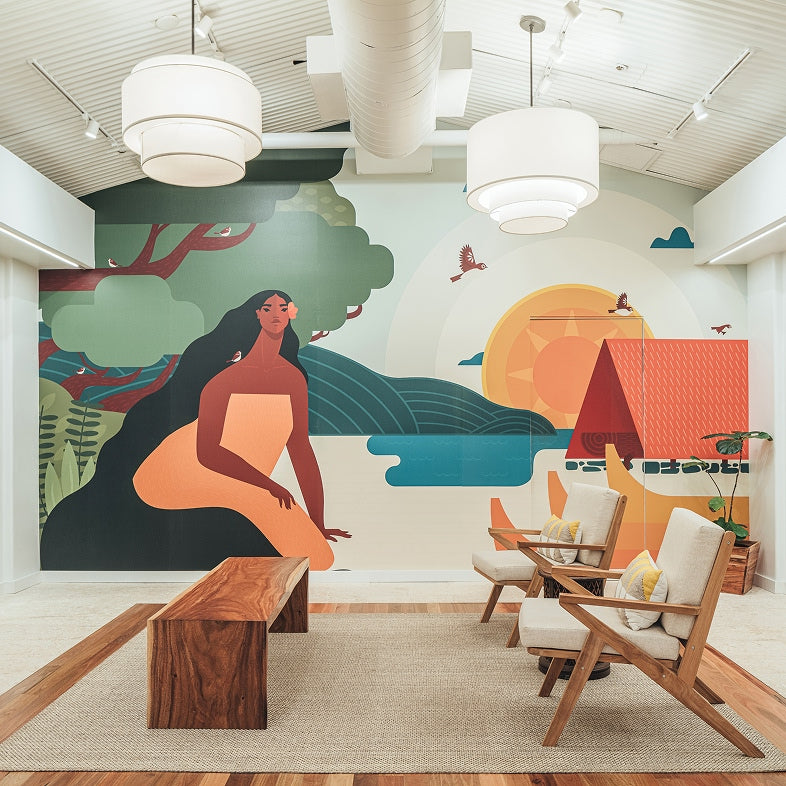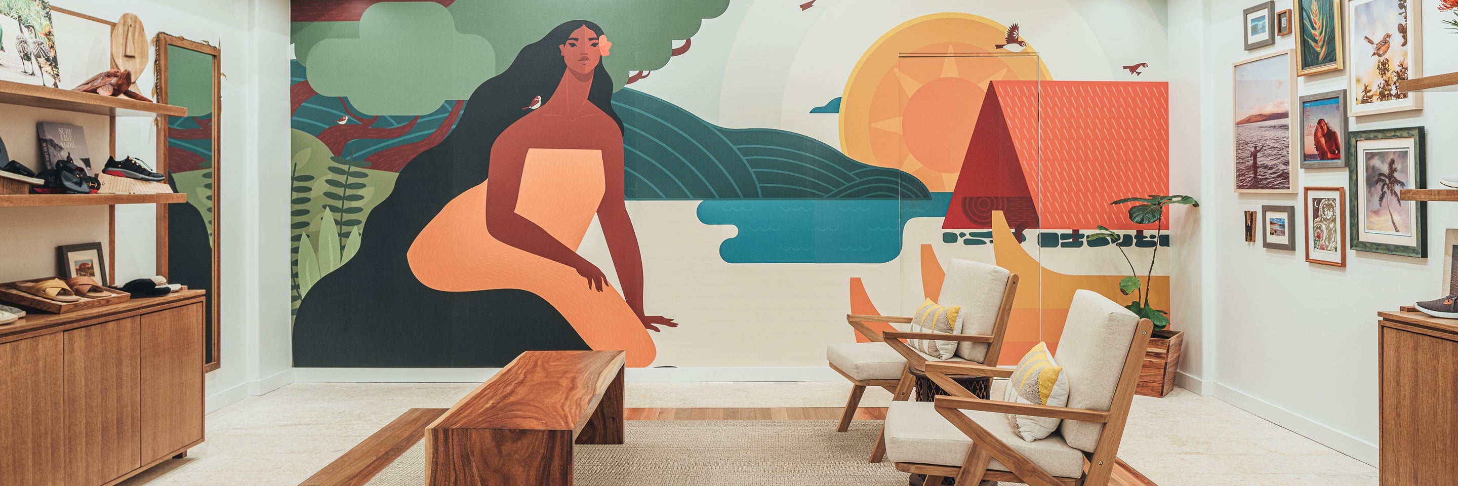 Custom artwork can be found throughout the store, including a mural by local artist Shar Tuiasoa which portrays Lea, the goddess of canoe builders who takes the form of the ‘elepaio bird. You'll also find six custom illustrations by Noa Emberson that further represent the ‘elepaio and its life.