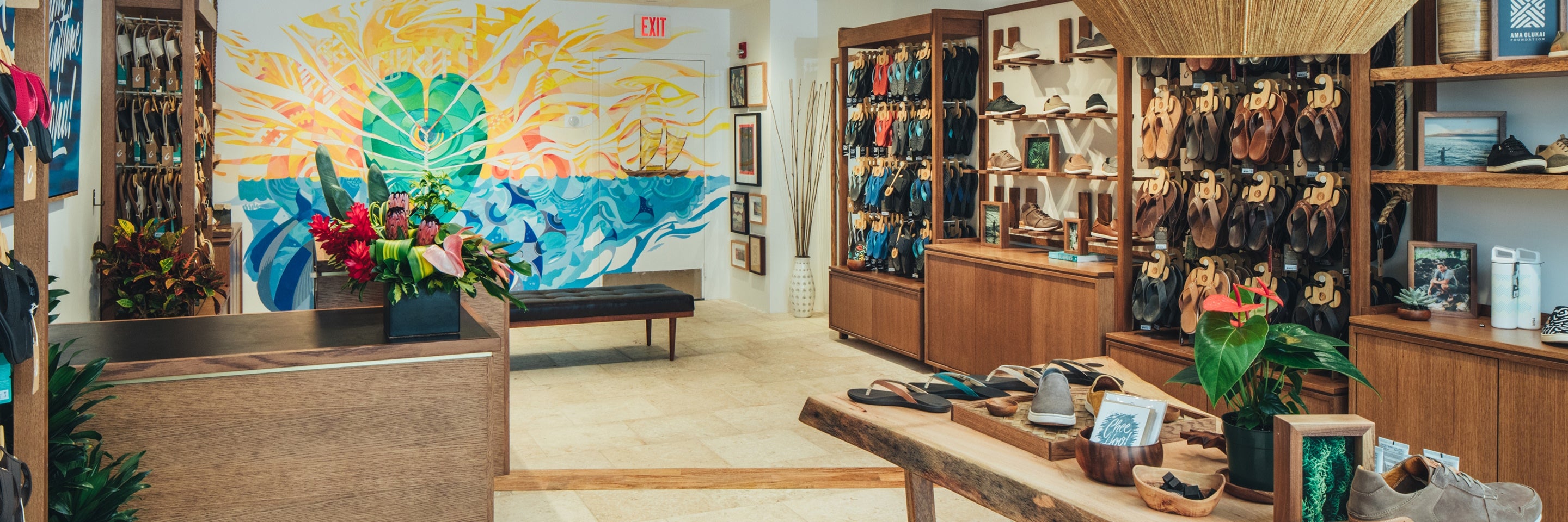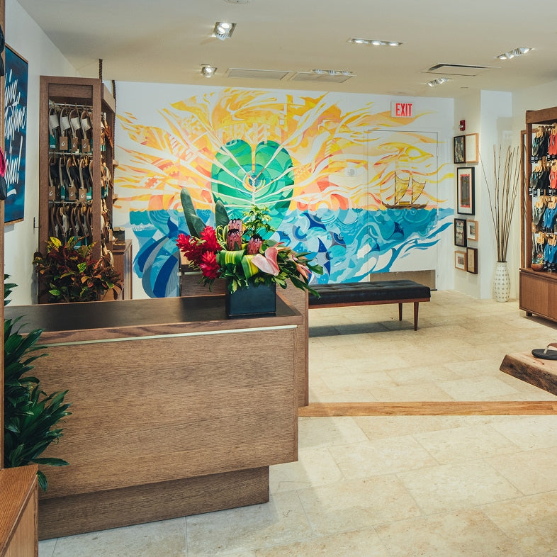 Custom art from Hawaiian artist adorn the walls including an Anywhere Aloha inspired piece by Pow! Wow! Artist Gavin Murai. In the Maui store, thereʻs an epic mural from art duo Wooden Wave that depict the stories of Maui in a colorful mauka to makai representation.